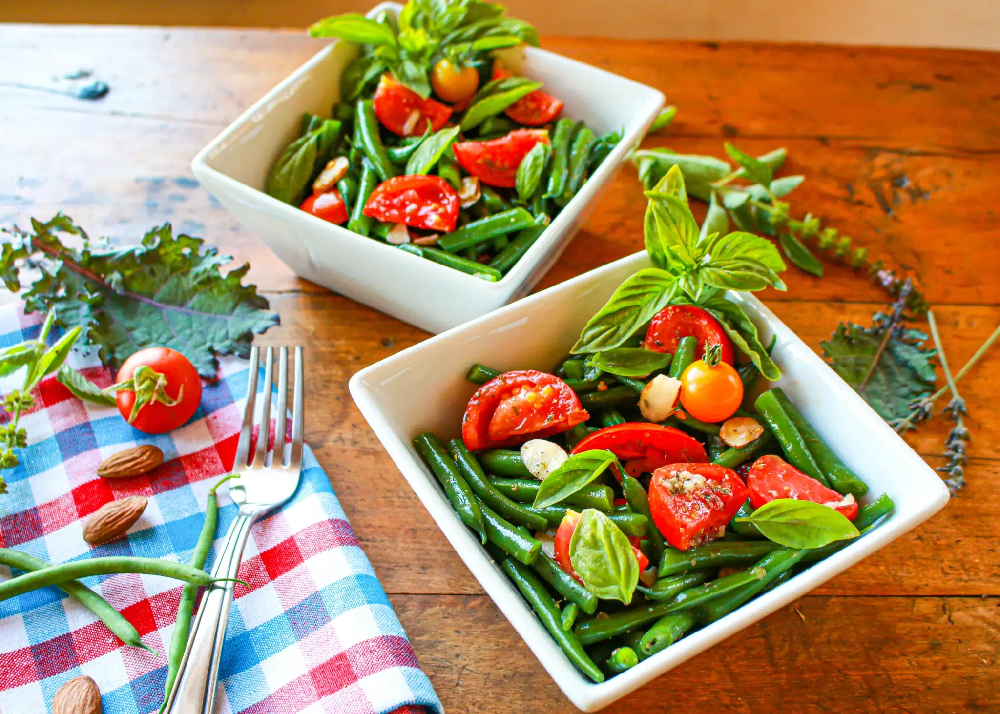 Light, fresh, and healthy! This easy vegan green bean tomato salad with almonds and herby red wine vinaigrette is the perfect summer side.